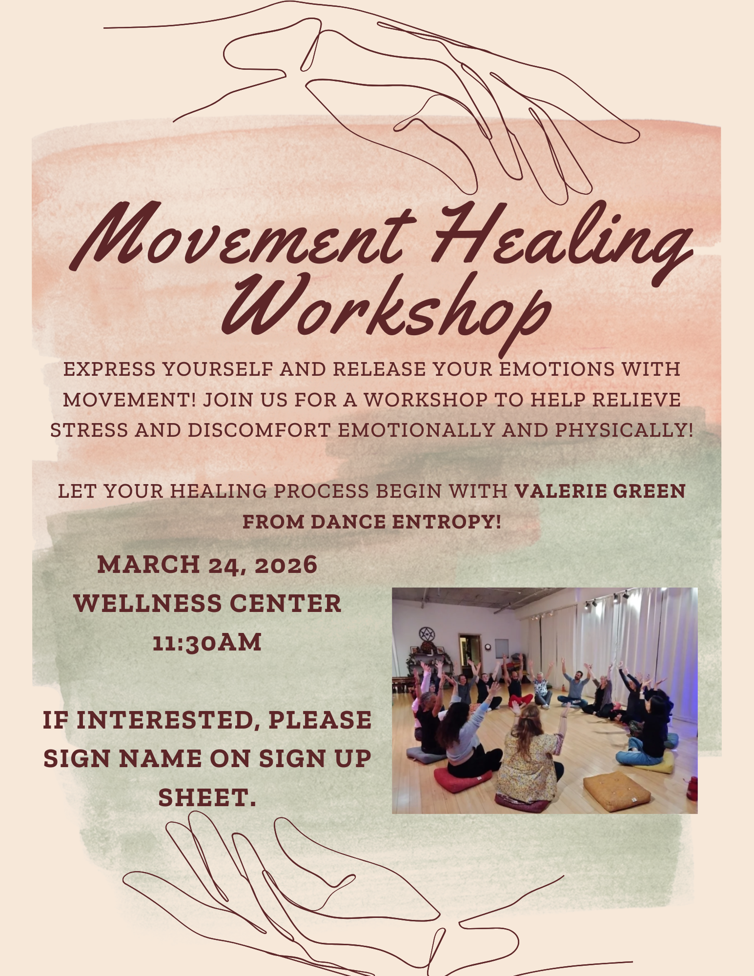 Each session is tailored to meet participants where they are. Using movement as a language beyond words, new emotions and insights may emerge, sparking curiosity, awareness, and heart-centered connection. Under the guidance of Valerie Green, choreographer, dancer, and Movement Healing Guide, participants explore personal expression and energy release, creating space for healing and renewal.